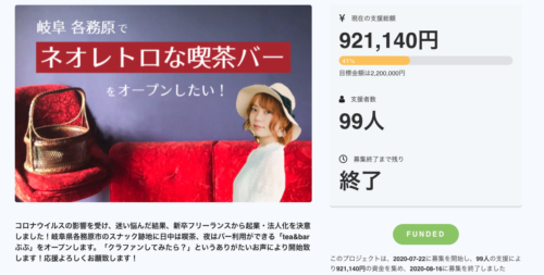 川合那奈さんは、クラウドファンディングにも取り組んでいますが、2020年8月16日に終了し、921,140円の資金を集めたのですが目標金額だった金額220万円に届きませんでした。